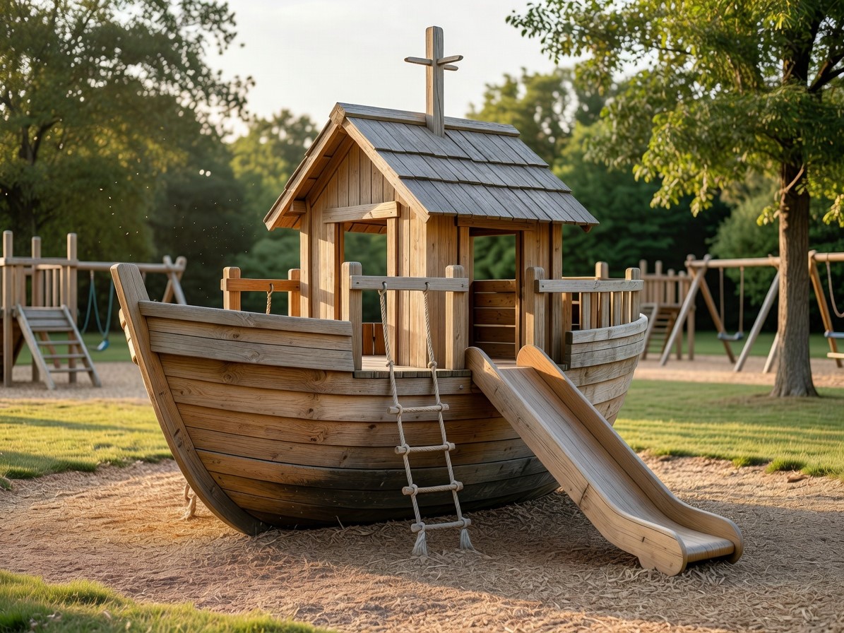 В парке конструкция должна быть заметной, тематически продуманной и рассчитанной на интенсивное использование. Здесь уместны большие игровые домики с несколькими уровнями, горками, подвесными мостами и канатными элементами. Тематика помогает создать узнаваемое место — «замок на холме», «деревня эльфов», «пиратский форт». Такие объекты становятся точками притяжения и повышают посещаемость парка. Для парков особенно важна вандалоустойчивость: выбирайте HPL-панели, оцинкованный металл, минимум съемных деталей.
